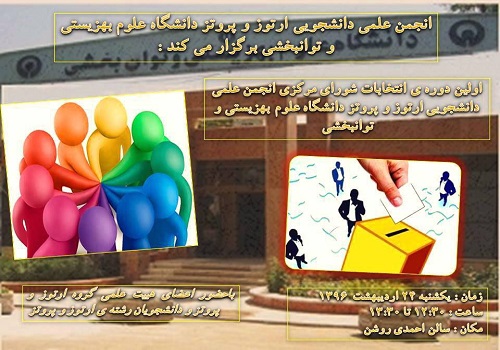 اولین دوره انتخابات شورای مرکزی انجمن علمی _ دانشجویی ارتز و پروتز دانشگاه علوم بهزیستی و توانبخشی با همکاری اداره تعالی فرهنگی و فوق برنامه ی معاونت فرهنگی و دانشجویی، در روز یکشنبه