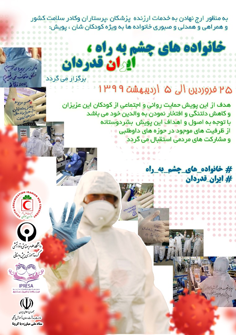 دانشگاه علوم بهزیستی و توانبخشی با همکاری جمعیت هلال احمر، انجمن مطالعات کودکان پیش از دبستان ایران و با حمایت وزارت بهداشت و ستاد ملی مبارزه با کرونا، پویش « خانواده های چشم به راه ، ایران قدردان » را از امروز در حمایت روانی و اجتماعی از اعضای کادر درمانی، خانواده های آنان بویژه کودکانشان، برگزار می کند.