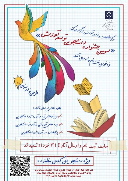 شایان ذکر است، جشنواره دانشجویی توسعه آموزش، در حیطه های « برنامه ریزی درسی، روش های تدریس، ارزشیابی برنامه، ارزیابی دانشجو، مدیریت در رهبری آموزش، راهنمایی و مشاوره دانشجویان، یادگیری الکترونیک، شبیه سازی آموزش، طراحی و تولید محصولات آموزشی » به منظور ارتقای کیفیت آموزش پزشکی و توسعه آن برگزار می شود.