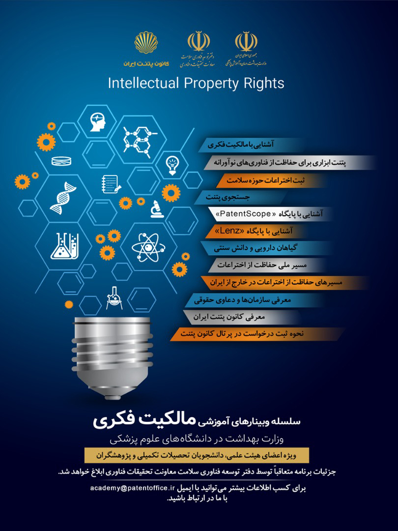 برگزاری سلسله وبینار های آموزشی « مالکیت فکری با محوریت حوزه سلامت »، به همت و تلاش دفتر توسعه فناوری سلامت معاونت تحقیقات وزارت بهداشت، درمان و آموزش پزشکی از تیرماه جاری آغاز می شود.