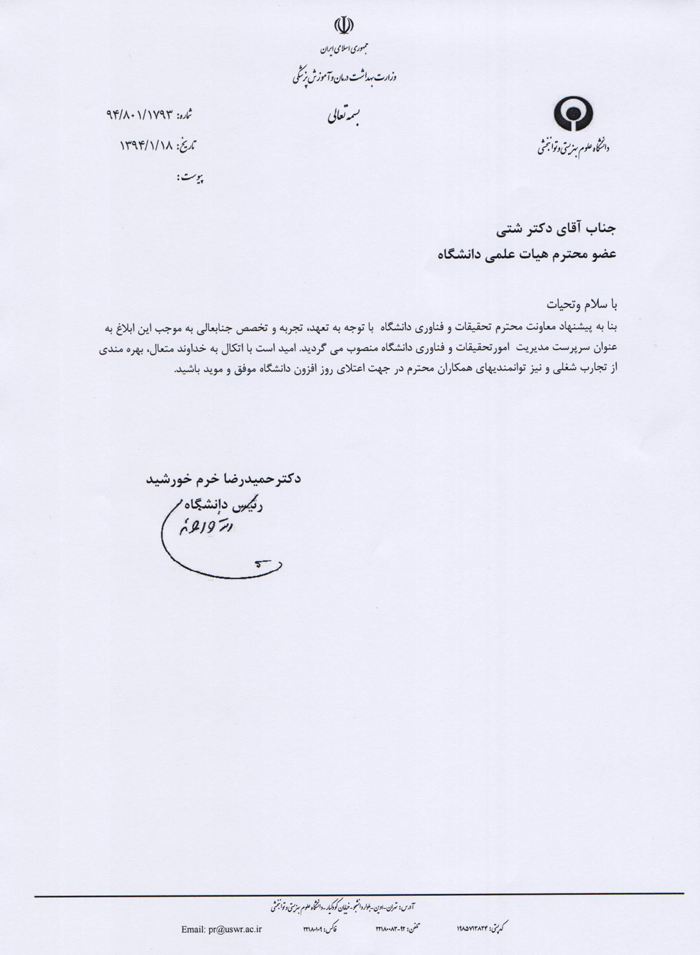 اخبار > طی حکمی از سوی رئیس دانشگاه دکتر محسن شتی به سمت سرپرست مدیریت امور تحقیقات و فناوری دانشگاه منصوب شد