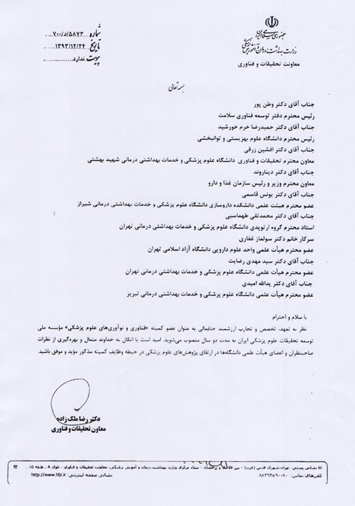اخبار > طی حکمی از سوی معاون تحقیقات و فناوری وزرات متبوع، دکتر حمیدرضا خرم خورشید به عنوان عضو «کمیته فناوری و نوآوری های علوم پزشکی» موسسه ملی توسعه تحقیقات علوم پزشکی ایران منصوب شد