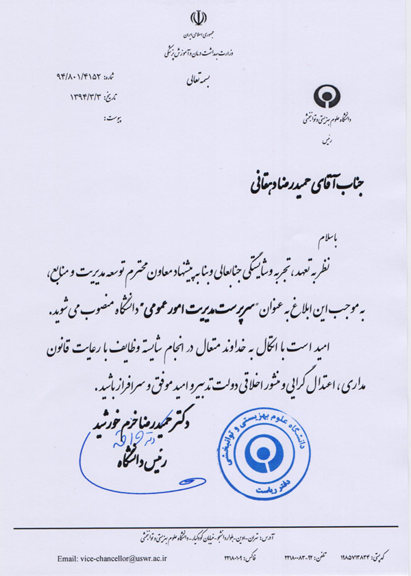 اخبار > طی حکمی از سوی رییس دانشگاه، حمیدرضا دهقانی به سمت سرپرست مدیریت امورعمومی منصوب شد