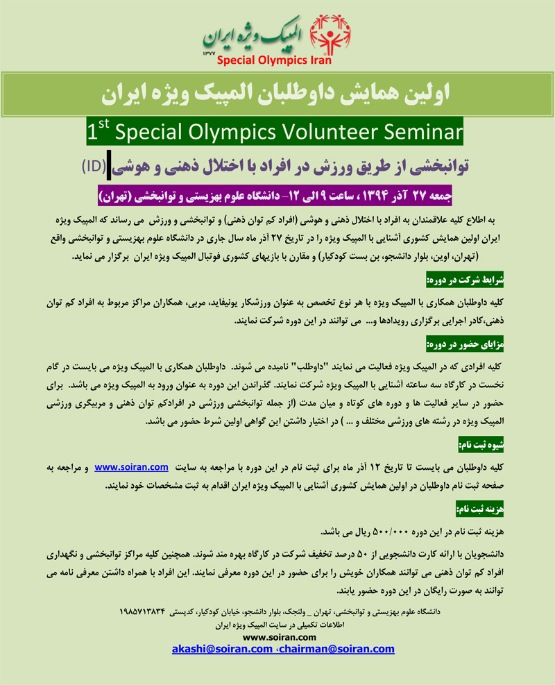 اخبار > اولین همایش داوطلبان المپیک ویژه ایران اولین همایش داوطلبان المپیک ویژه ایران با عنوان توانبخشی از طریق ورزش در افراد با اختلال ذهنی و هوشی